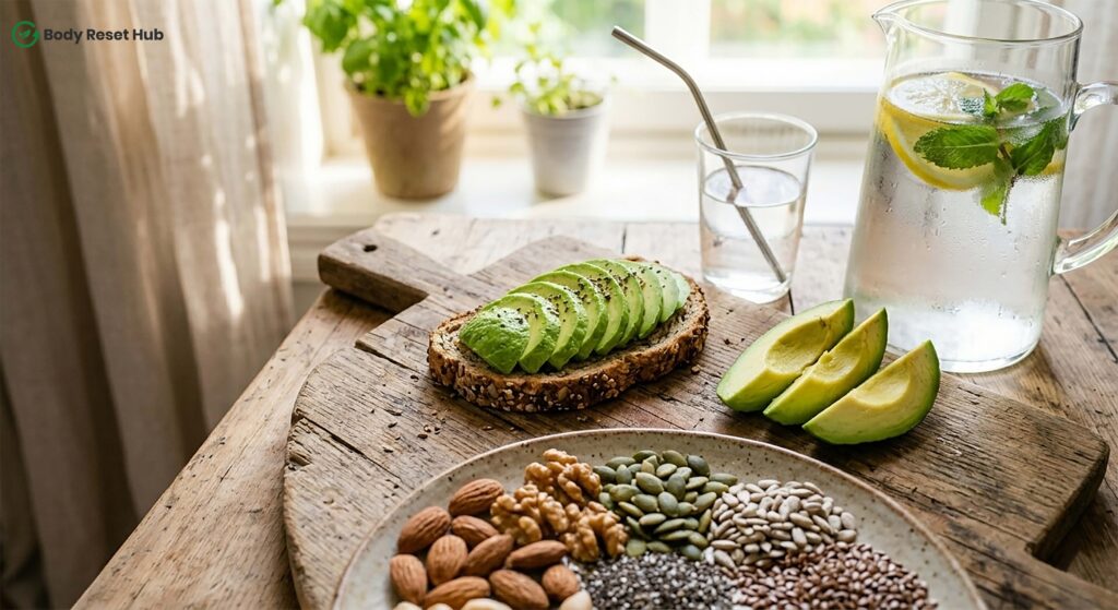 For years, we were told, “Fat makes you fat.” That is a giant lie. Your brain and your hormones (which control weight loss) are made of fat! Adding a little bit of avocado, a handful of soaked almonds, or a spoon of virgin olive oil to your meals tells your body it is safe to burn its own stored fat.